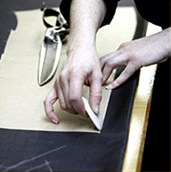 一套凱利易紳正裝,且體師要進(jìn)行20—30個(gè)數(shù)據(jù)的測(cè)量,在做的過程中,還要隨時(shí)找到身上的細(xì)微變化,以確保數(shù)據(jù)準(zhǔn)確無誤,并留下相關(guān)的影像資料備用.然后工藝師核對(duì)相關(guān)數(shù)據(jù),用紙板打出紙樣,進(jìn)行面料的裁剪。